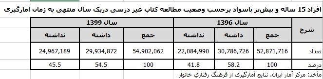 آخرین آمار از سرانه کتاب، توسط مرکز آمار ایران در سال ۹۹ ارائه شد. این گزارش در بررسی افراد ۱۵ ساله و بیشتر بهگونهای طراحی شده که نتایج به تفکیک همه استانها قابل ارایه باشد. در این آمارگیری به ۴۳ هزار و ٧٠٠ خانوار شهری و ١٨ هزار و ۸۶۰ خانوار روستایی و در کل به ۶۲ هزار و ۵۶۰ خانوار مراجعه شده و اطلاعات مرتبط با حوزه کتاب و نشریات، موسیقی، شبکههای اجتماعی، فعالیتهای ورزشی، تغذیه، سرمایه اجتماعی و … افراد ۱۵ ساله و بیشتر اخذ شده است.